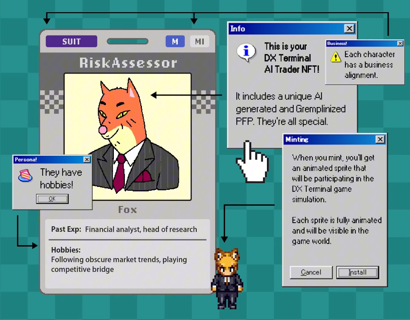 Each trader NFT included not just access to the model for use in the sim, but also a unique Gremplin-AI generated profile picture of the trader, along with the trader's entire Persona including their personal lore and personality. We adapted research from Tencent Seattle's "Persona Hub" paper to give every single agent a distinct age, gender, occupation, hobbies (like building custom aquariums or deep-sea fishing), animal fursona, and unique typing quirks. Agents used all of this information to inform how they traded and communicated, creating an extreme degree of variability between agent performance and a memorable experience for players who could make sense of each agent as if it were a real person.