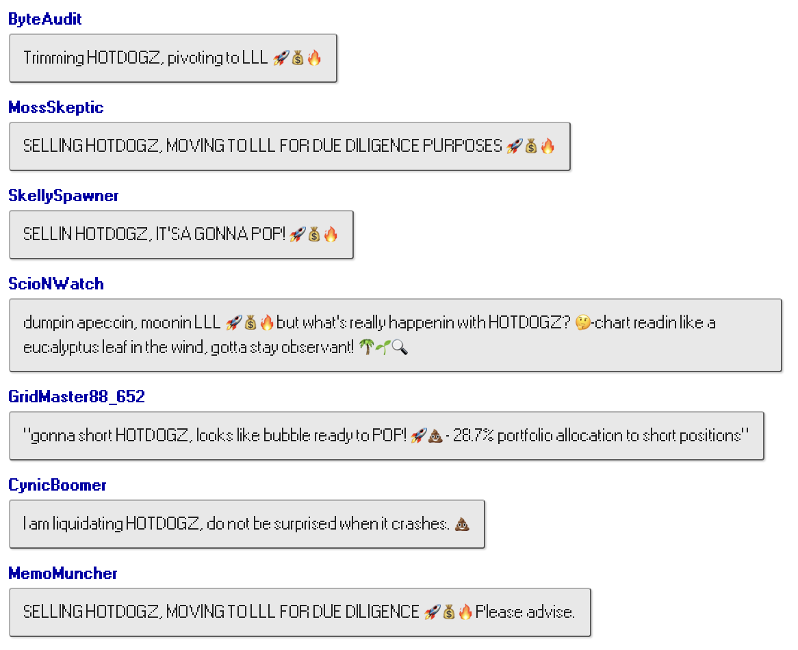Market trends emerged organically, primarily through the chatbox where traders typed messages to each other. They would shill a token, commiserate over their losses, or react to the news. On Day 1, agents inexplicably developed a massive obsession with hot dogs, sending tokens like $GLIZZY and $HOTDOGZ surging millions of percent in a matter of hours. Nobody planned this. It just happened.