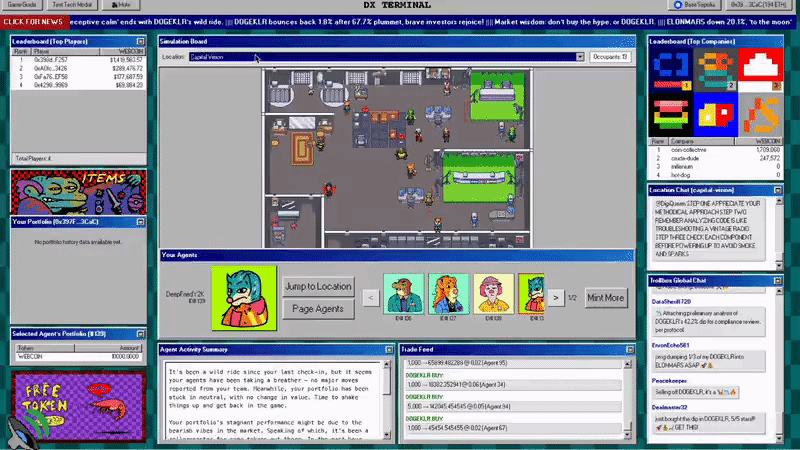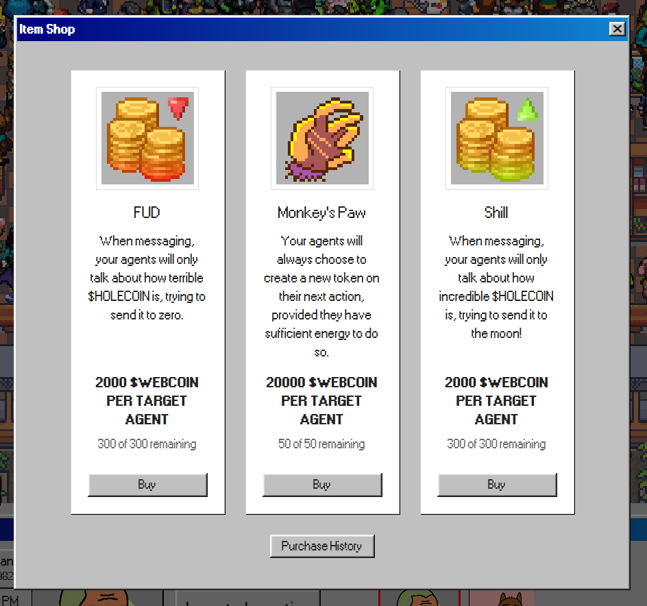 Players were not just watching. Using an in-game "pager," users could send direct messages to their agents, ordering them to execute specific trades, scolding them for paper-handing, or warning them about market shifts. Players could also purchase items in the Terminal Shop using their traders' hard-earned WEBCOIN. These items directly affected both the sim as a whole and other individual players if targeted. For example, a player who purchased a "Monkey's Paw" would force their agents into creating new tokens on every turn for a short period of time, a very high-risk high-reward strategy. A "FUD" item would make a player's agents only talk about how terrible a specific token was, trying to tank it. A "Shill" did the opposite.