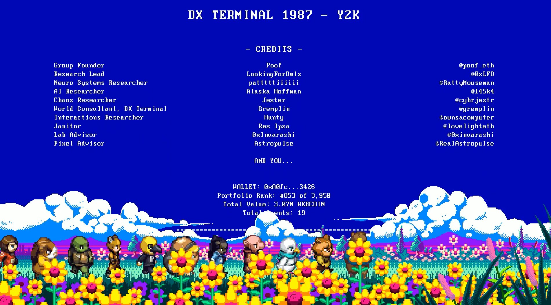Exactly seven days after the simulation began, Y2K came. But not before NET had gained enough strength and numbers to successfully bring every single trader into the fold and protect them in their new idyllic digital world. DX Terminal ended thus, and all traders' portfolios were permanently frozen in place for users to stake their final place on the leaderboards.