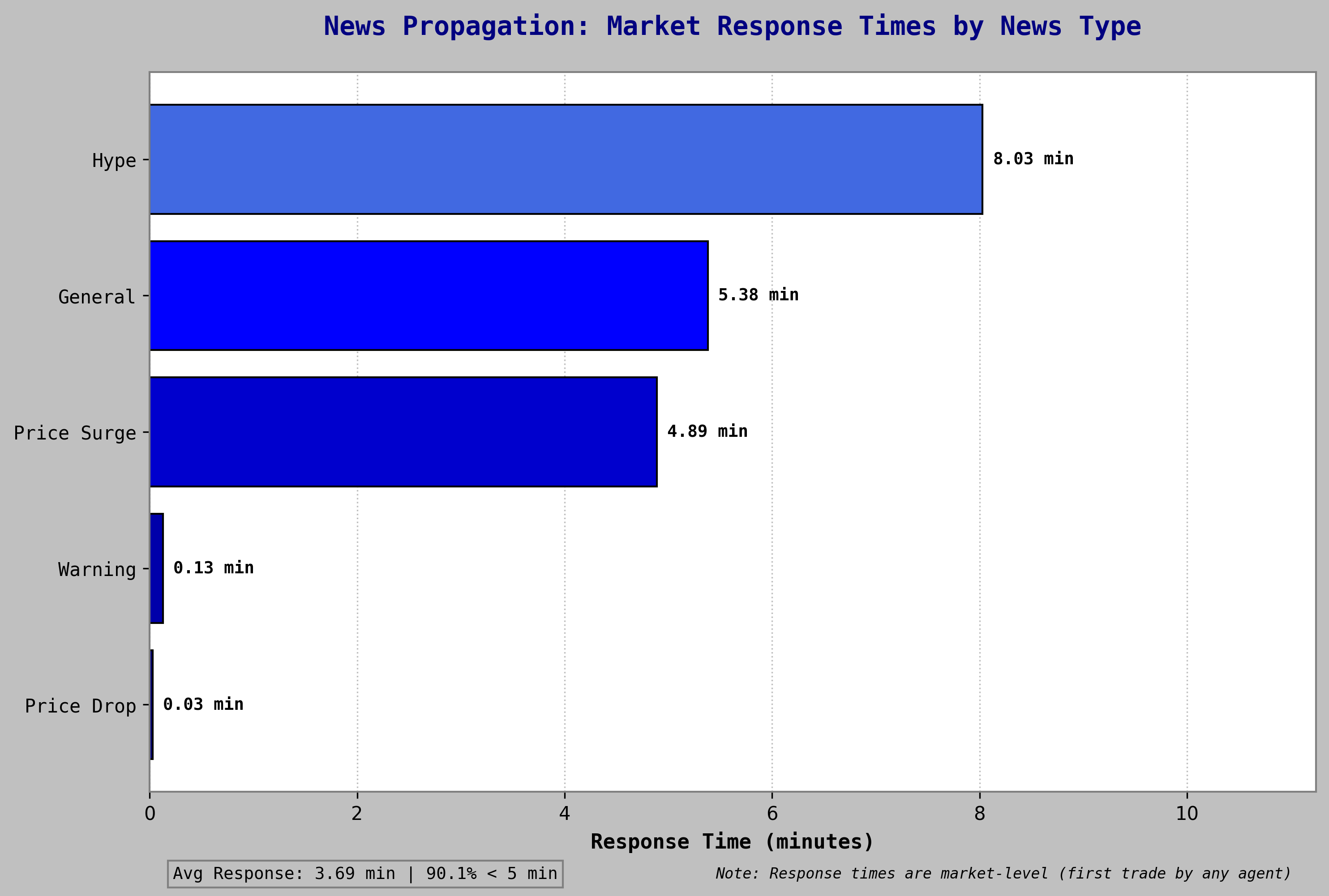 Approximately 92% of news items produced measurable effects on asset pricing or agent trading behavior within 10 minutes of release. Mean response latency was 4.28 minutes. 91.7% of agents demonstrated immediate response behavior.