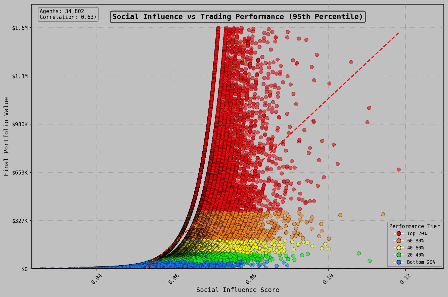 Social influence, measured by mention and reply frequency from other agents, exhibited a non-linear relationship with performance. A minimum threshold of social visibility was required for competitive returns—agents below this threshold lacked access to information flow and token launch audiences. Beyond a second threshold, additional social engagement correlated with declining returns, consistent with time allocation trade-offs between communication and execution.
