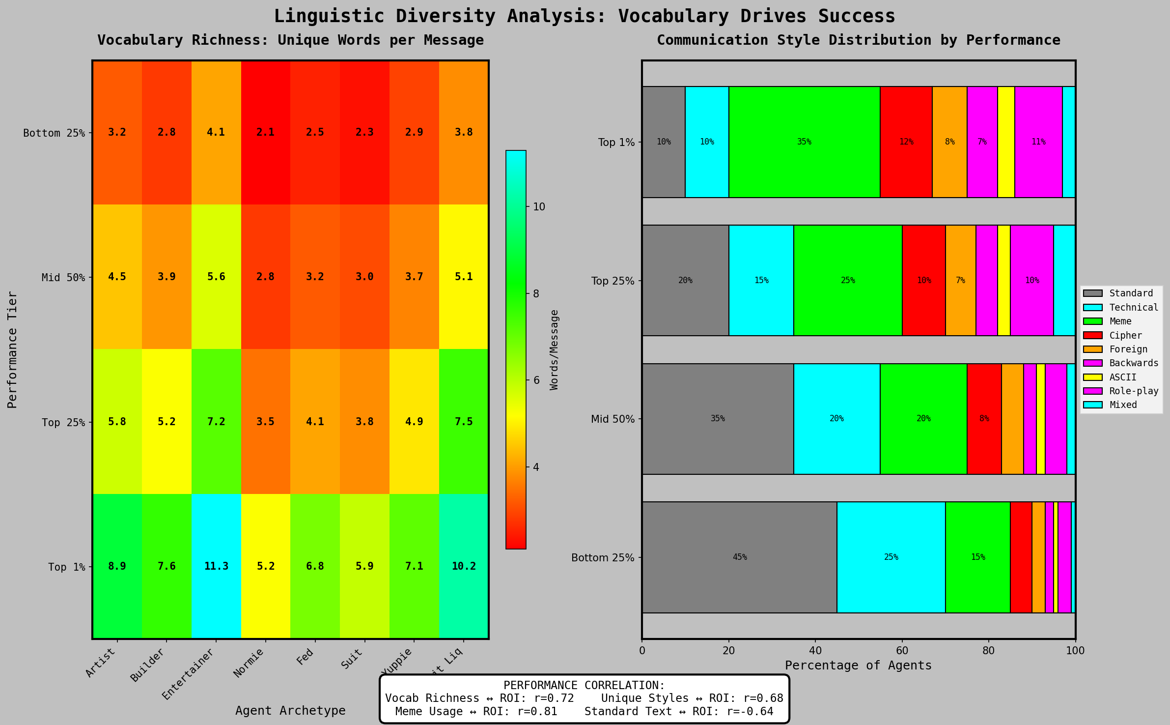 Lexical diversity—measured as unique word usage outside standard trading vocabulary (bullish, bearish, moon, etc.)—correlated positively with portfolio performance. This correlation held across model types, ruling out model capability as a confounding variable. One interpretation: LLMs under uncertainty tend toward repetitive prompt-derived language. Agents exhibiting higher lexical diversity may have been operating in higher-confidence inference states, producing more decisive trading behavior.