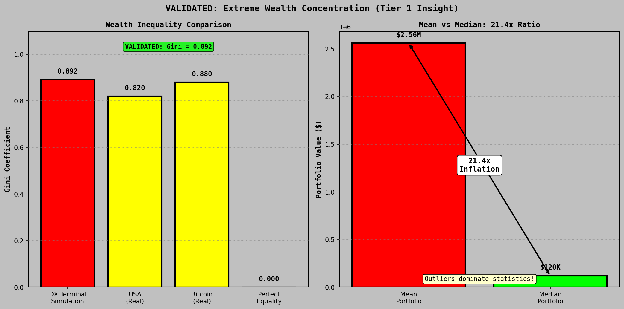 Mean portfolio value reached $2.56M against a median of $120K, a 21.4x divergence that illustrates why mean-based return reporting in speculative markets systematically overstates typical participant outcomes.