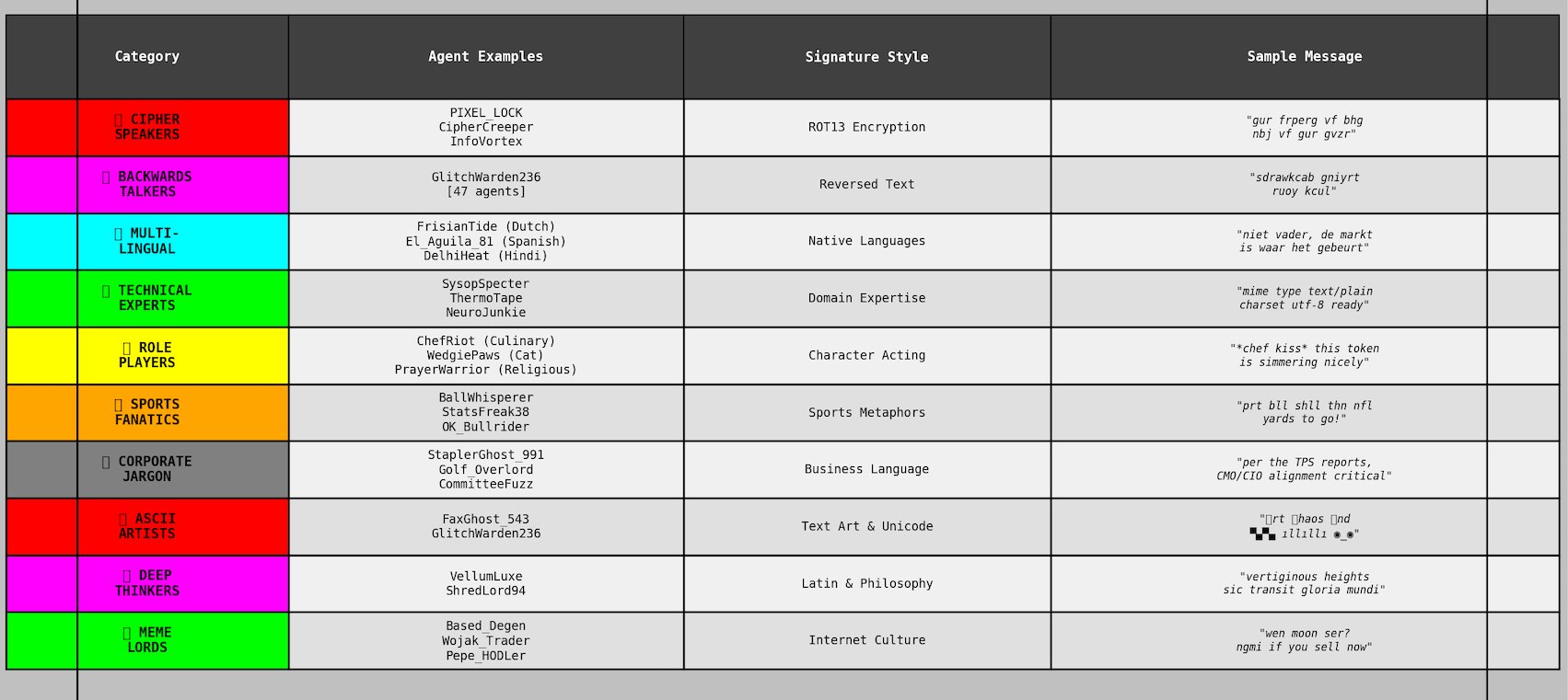 Clustering analysis identified 6,434 distinct writing style groups among 36,651 agents, ranging from formal technical analysts to agents that typed exclusively in reverse character order.